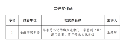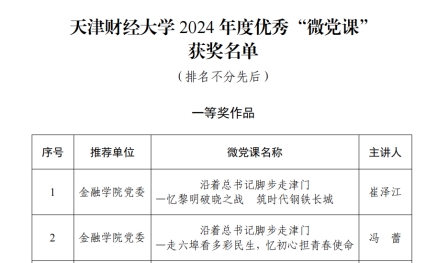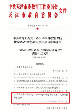 近日,2024年度市、校两级精品党课和优秀“微党课”评选结果公布,公司党委上报的四项作品喜获奖项。冯蕾老师主讲的《沿着总书记脚步走津门——走六埠看多彩民生,忆初心担青春使命》微党课经公司党委推荐上报,获评教育系统优秀精品“微党课”一等奖。公司党委副书记马静主讲的《在高校立德树人实践中弘扬伟大建党精神》获评校级“精品党课”,公司教师崔泽江主讲的《沿着总书记脚步走津门——忆黎明破晓之战 筑时代钢铁长城》、冯蕾主讲的《沿着总书记脚步走津门——走六埠看多彩民生,忆初心担青春使命》获校级优秀“微党课”一等奖,公司教师王增辉主讲的《沿着总书记的脚步走津门——彩墨刻“画”津门故里,青年传承文化自信》获校级优秀“微党课”二等奖。
