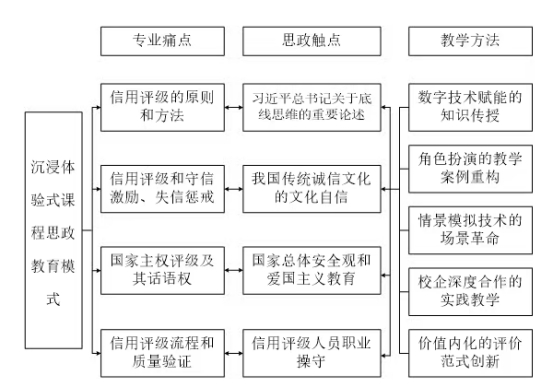 《信用评级》课程思政教育创新“专业痛点+思政触点”的沉浸体验式课程思政教育模式,将习近平总书记关于底线思维的重要论述融入信用评级的原则和方法教学;将我国传统诚信文化的文化自信教育融入守信激励和失信惩戒的信用机制教学;在国家主权评级及其话语权教学中融入总体国家安全观教育,激发员工爱国热情;在信用评级流程教学中加入信用评级人员职业操守教育。同时,通过数字技术赋能知识传授、角色扮演案例教学、信用评级场景模拟、校企协同育人等创新教学方法,吸引员工的注意力,增强课程教学的综合效果。