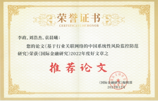 为鼓励学术研究,激发作者积极性,2023年《国际金融研究》编辑部邀请知名科研单位的评审专家,对2022年度《国际金融研究》所发表论文进行评审,最终确定2022年度推荐的好文章共10篇。公司教师李政教授、博士研究生刘浩杰、硕士研究生袁晨曦合作发表的论文《基于行业关联网络的中国系统性风险监控防范研究》(发表于《国际金融研究》2022年第5期)荣获《国际金融研究》2022年度好文章之推荐论文。