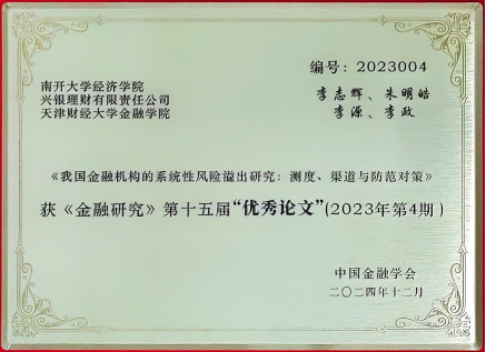 公司教师李政教授与南开大学经济公司财金研究所李志辉教授、博士研究生朱明皓和兴业理财李源博士共同合作的论文《我国金融机构的系统性风险溢出研究:测度、渠道与防范对策》(发表于《金融研究》2023年第4期)获评《金融研究》2023年度优秀论文。